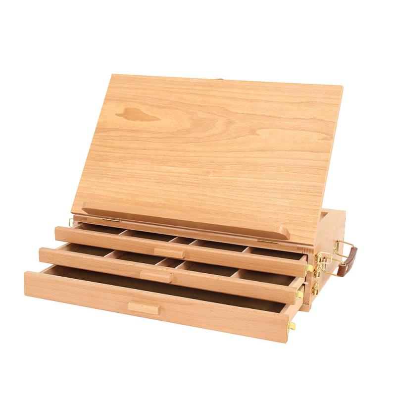 Настольный мольберт с тремя выдвижными ящиками отлично подходит для акварели и пастели. На мольберте можно закрепить лист бумаги малярным скотчем, а в ящике хранить кисти, краски и пастель. Угол наклона регулируется. Выполнен из бука, покрыт лаком.