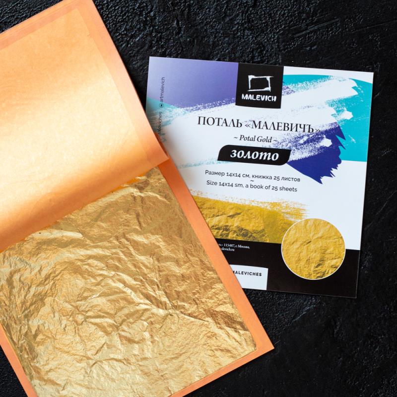 Поталь используется в живописи и графике, а также для золочения рам, предметов интерьера, декоративной керамики, стекла и др. Изысканный блеск металла добавит любой работе спецэффектов и шарма. Тончайшие листы цветной фольги форматом 14х14см собраны в удобные книжечки по 25 листов в каждой. В ассортименте бренда 'Малевичъ' представлена поталь 3 видов - золото, серебро и медь.