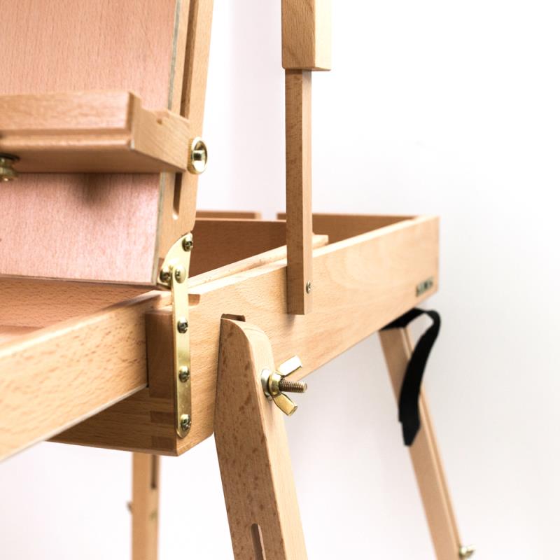 Вместительный этюдный ящик с улучшенной конструкцией, оснащен 4 ножками для максимальной устойчивости. Может использоваться как для работы в помещении, так и на пленэре. Ножки и полка для холста регулируются по высоте, что позволяет подстроить этюдник под свой рост, работать как сидя, так и стоя. В ложенном виде его можно использовать как настольный мольберт. В комплект входит палитра и ремешок для ношения на плече. Выполнен из бука
