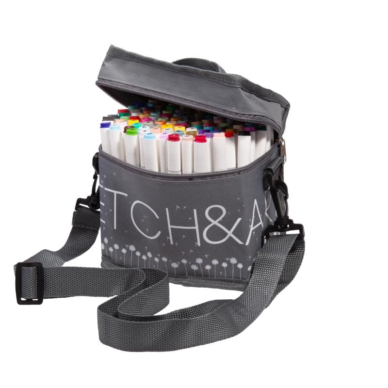 Высококачественные профессиональные маркеры 'SKETCH&ART' для рисования, набросков, дизайнерских работ. Эргономичный трехгранный корпус из полипропилена - легкий и ударопрочный. Плотно защелкивающиеся колпачки обеспечивают долгую сохранность чернил от высыхания, а рельефное нанесение в форме точек на их поверхность предотвращает скольжение руки при открывании. Маркер имеет два наконечника из износостойкого волокна - пулевидный с шириной линии 1 мм и скошенный, позволяющий варьировать ширину линии от 1 до 5 мм. Перманентные чернила на спиртовой основе не токсичны и быстро сохнут на поверхности, оставляя яркий след. Маркеры хорошо ложатся на бумагу разной фактуры и плотности. Более гладкая бумага дает больше простора для смешения цветов и создания градиентов. Маркеры можно использовать и для создания рисунков на стекле, и на светлом пластике, предварительно обезжирив их поверхность. Стойкость и яркость цвета гарантированы! Следы от маркеров легко отстирываются и отмываются с помощью моющих средств. Маркеры упакованы в текстильную сумку (17x12x16.5см) с регулируемым плечевым ремнем и внешнем кармане - удобно хранить и транспортировать.