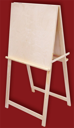 Мольберт напольный имеет 2 рабочих поверхности из фанерного щита размером 60х60 см. Угол наклона фиксируется стопорной планкой в пяти положениях от 60 до 80 градусов. Каждая из рабочих сторон снабжена полкой для принадлежностей.