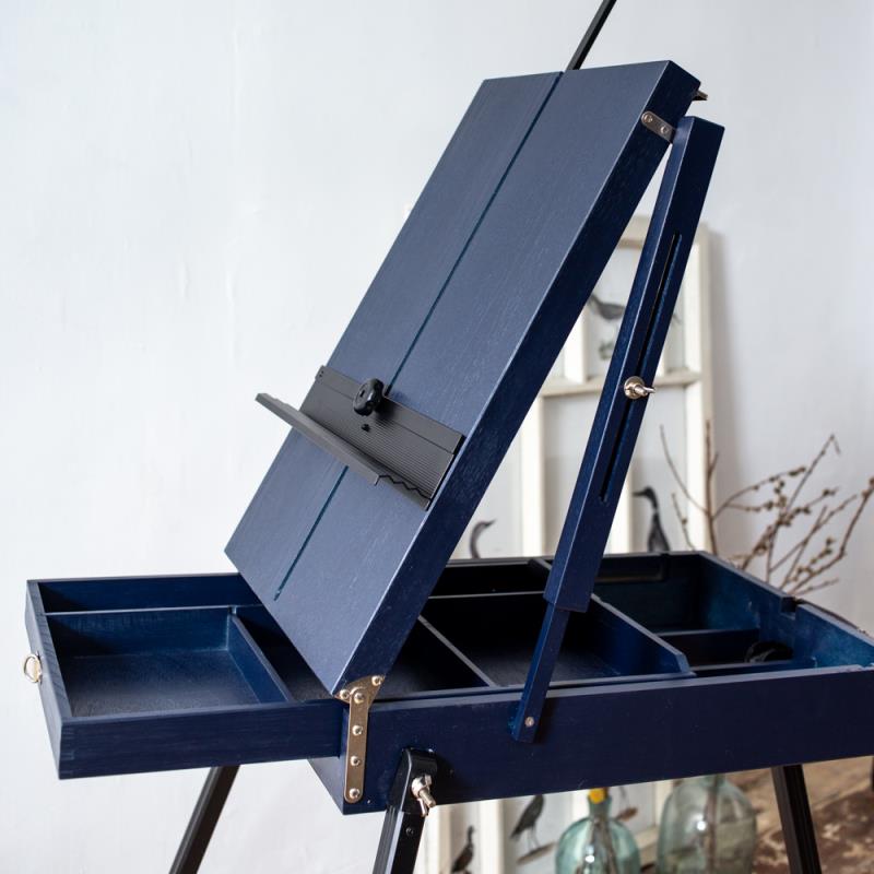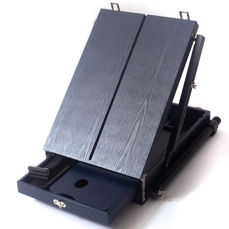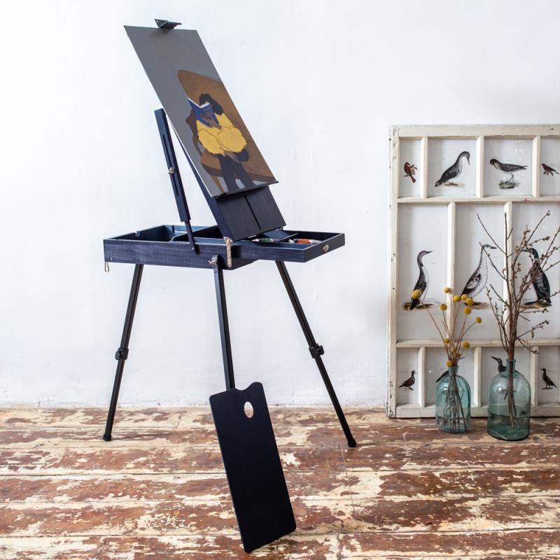 Современный стильный этюдник, который сочетает в себе два материала - дерево и металл. Ножки и держатели холста этюдника выполнены из алюминия, ящик сделан из сосны и затонирован в темно-синий цвет. Благодаря такому сочетанию материалов этюдник получается невероятно легким, при этом его функциональность такая же, как и у более дорогих моделей из бука. В комплект входит палитра и ремешок для ношения на плече.
