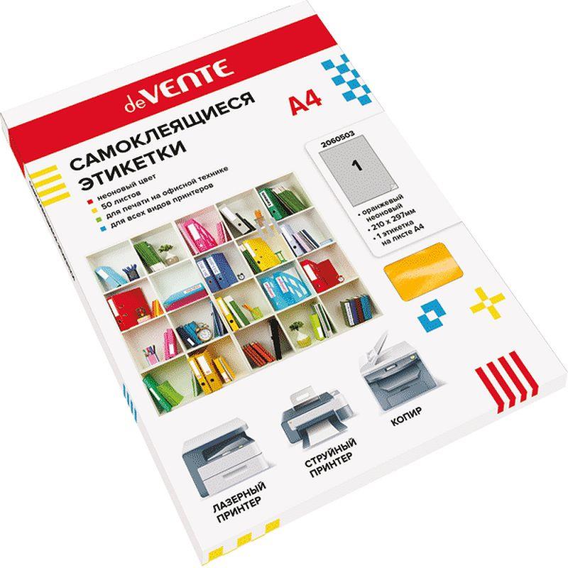 Этикетки самоклеящиеся бумажные   1шт/A4 210х297мм I/L/C оранжевые 'Неон'  50л deVENTE