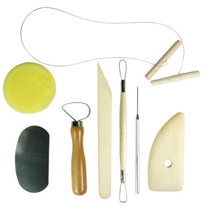 Набор для моделирования включает в себя 8 предметов: 1 деревянный резец, 1 деревянный стек, 2 стека с петлей, 1 шило из нержавеющей стали, 1 стальная проволока, 1 скребок алюминиевый, 1 губка из поролона.