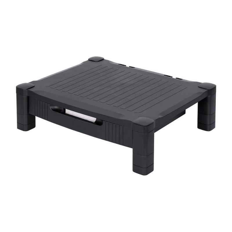 Подставка идеально подходит для размещения монитора весом до 15кг. Регулируемая высота: от 100 до 130мм. Оснащена выдвижным ящиком для мелочей. Материал: пластик Размеры: 435х-100-130хх333мм Вес: 1.7кг