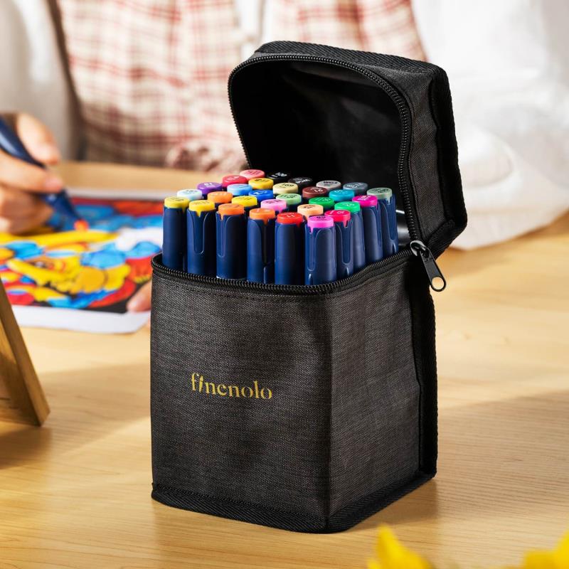 Двусторонние спиртовые маркеры Finenolo прекрасно подойдут для новичков в маркерном скетчинге. Каждый маркер имеет два наконечника: гибкий наконечник-кисть для линий разного размера и наконечник-долото для крупных заливок и проработки деталей (ребром наконечника-долото). В наборе есть маркер-блендер с бесцветными чернилами для смешивания цветов и изменения тональности цветов. Рекомендуется использовать специальную бумагу для маркеров, гладкую и белую. Маркеры поставляются в тканевых кейсах с ручкой для переноски. Внутри кейса маркеры расположены на пластиковой подставке. Торцы колпачков окрашены в цвет чернил, на них нанесены номер и название.