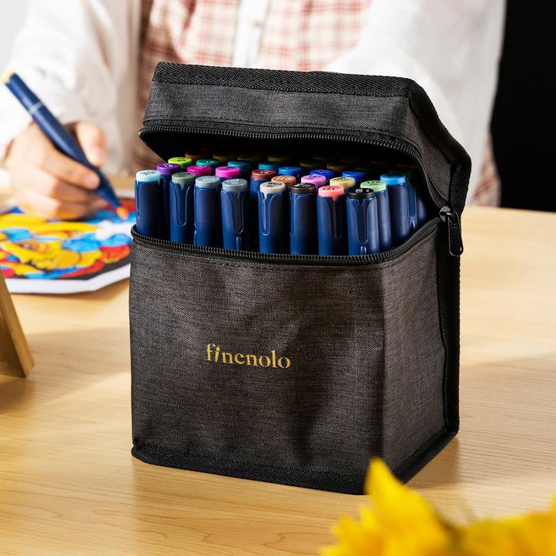 Двусторонние спиртовые маркеры Finenolo прекрасно подойдут для новичков в маркерном скетчинге. Каждый маркер имеет два наконечника: гибкий наконечник-кисть для линий разного размера и наконечник-долото для крупных заливок и проработки деталей (ребром наконечника-долото). В наборе есть маркер-блендер с бесцветными чернилами для смешивания цветов и изменения тональности цветов. Рекомендуется использовать специальную бумагу для маркеров, гладкую и белую. Маркеры поставляются в тканевых кейсах с ручкой для переноски. Внутри кейса маркеры расположены на пластиковой подставке. Торцы колпачков окрашены в цвет чернил, на них нанесены номер и название.