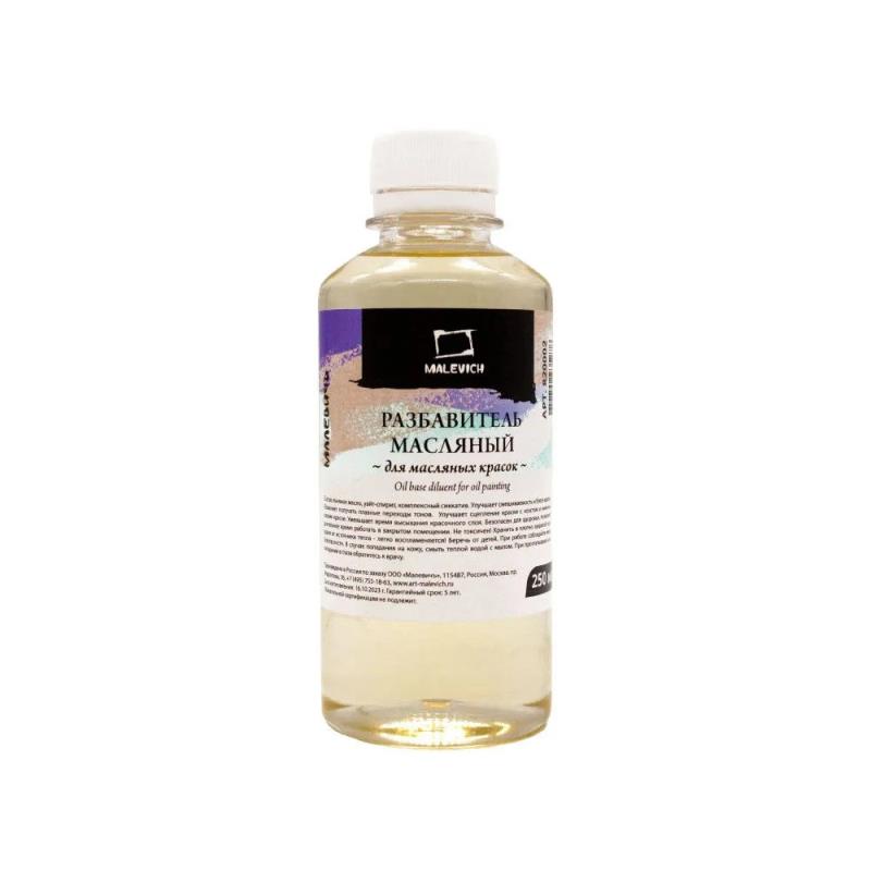 Разбавитель масляный 'Малевичъ' делает краски менее насыщенными и более прозрачными, позволяя получать плавные переходы тонов. Также улучшает адгезию и разносимость красок, делая их более текучими. Разбавитель быстро высыхает, не желтеет.