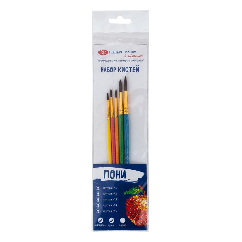Кисти серии 'Я - Художник!' с ворсом пони идеально подойдут для работы с гуашью и акварелью. Ручка окрашенное дерево. Кисти различного размеры круглой формы: № 1,2, 3, 4, 5.