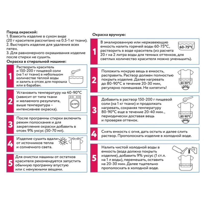 Окраска в стиральной машине: растворить краситель и 150-200г пищевой соли (на 1кг ткани) в небольшом количестве теплой воды и залить в отсек для порошка или в барабан. Стирать при температуре 40-90С (зависит от типа ткани и желаемого результата, выше температура - интенсивнее окраска). После стирки установить режим полоскания и для закрепления окраски добавить в отсек 9% уксус (50-70мл). Изделие сушить вдали от источников тепла и солнечного света. Для очистки машины от остатков красителя рекомендуется запустить обычную программу впустую или с ненужными вещами.