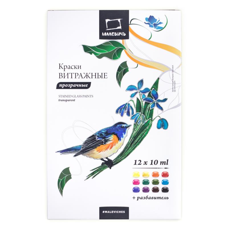 Витражная прозрачная акриловая краска 'Малевич' на водной основе предназначена для росписи стекла, фарфора, предметов из светлой керамики и зеркал. Краски светостойкие, отлично смешиваются, легко наносятся и быстро высыхают. В набор входит разбавитель-медиум, при помощи которого можно варьировать густоту краски, создавая элементы и декоративные изображения различной степени прозрачности.