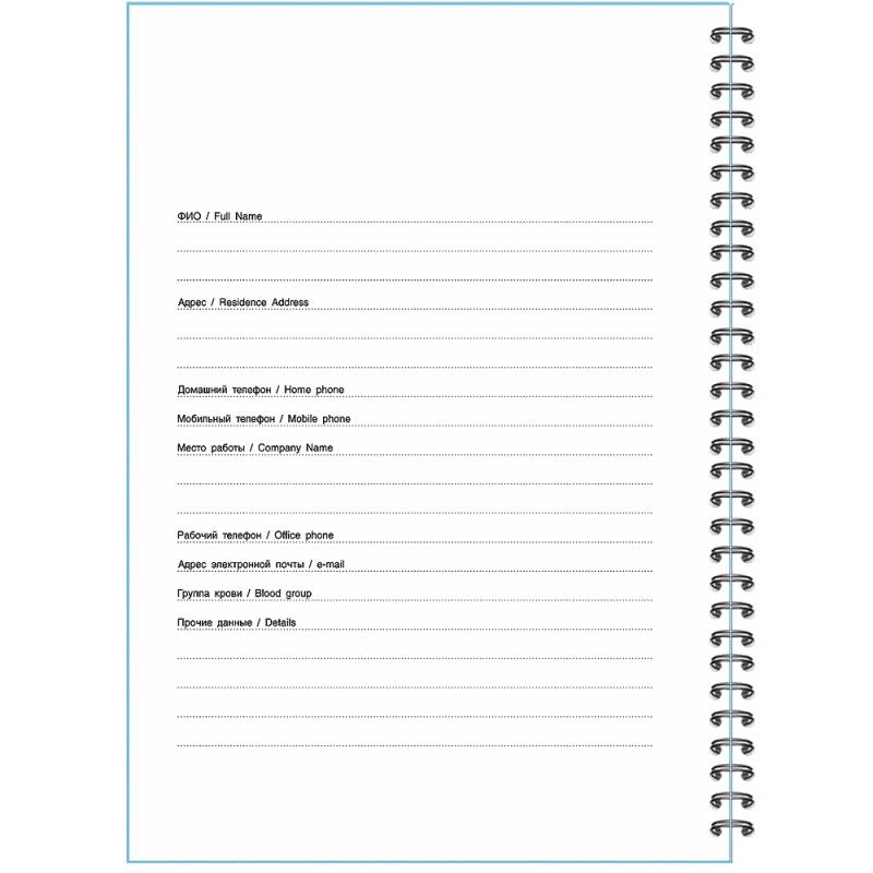 Тетрадь с обложкой из жесткого пластика со кругленными углами на металлическом гребне, титульный лист с персональными данными, шелкография.