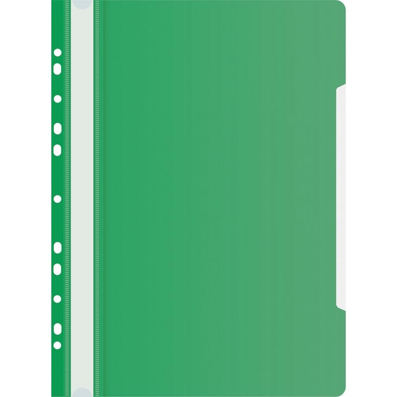Скоросшиватель для перфорированных листов формата А4 из плотного мягкого пластика с прозрачной верхней обложкой и дополнительной боковой перфорацией для подшивки в папки с кольцевым механизмом.