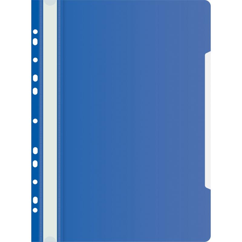 Скоросшиватель для перфорированных листов формата А4 из плотного мягкого пластика с прозрачной верхней обложкой и дополнительной боковой перфорацией для подшивки в папки с кольцевым механизмом.