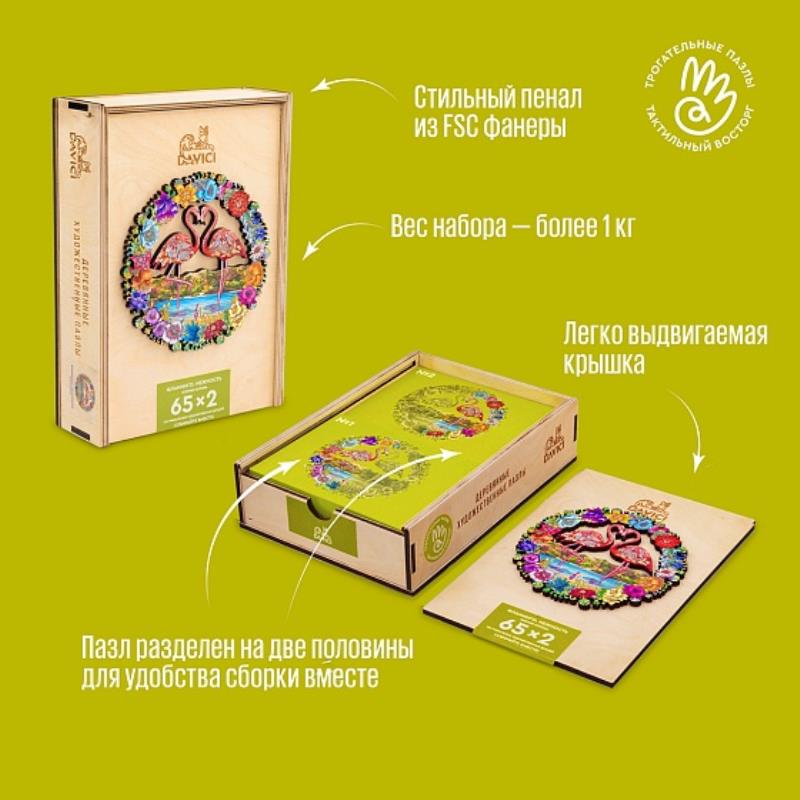 Фламинго - символ любви, равенства и верности. Картина и детали пазла являют образы из жизни птиц: истории любви и их продолжение в семье, птенцы и гнездование. Красоту картины усиливают деревянные детали с диковинными цветами. Замысловатая загадка из 11 деталей. Сложите историю любви в “сердечном обрамлении”. Рассмотрите сложенный пазл с деревянной стороны - и вы увидите новое воплощение картины в проявленных узорах DAVICI.