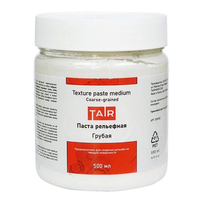 Пластичная акриловая паста используется для моделирования рельефных поверхностей. Рельефная акриловая паста представляет собой водорастворимую смесь акриловой смолы и тонкомолотого мрамора. Пасту можно смешивать с любыми акриловыми материалами Таир, акриловыми красками, гуашью, акварелью, другими водорастворимыми красками. Добавление в пасту акрилового лака увеличивает пластичность массы. После высыхания акриловая рельефная паста представляет собой пористую поверхность умеренной шероховатости, на нее хорошо ложатся любые краски: масляные, акриловые и прочие. Грубая паста позволяет создавать объемные рельефные работы. Наносить пасту можно на практически любую достаточно твердую поверхность. На впитывающие поверхности рельефную пасту можно наносить после предварительной грунтовки с помощью акрилового грунта, разбавителя или разведенного водой акрилового лака. Для нанесения пасты на отделываемую поверхность применяется мастихин или шпатель, рельеф формируется любыми инструментами по выбору мастера. Для просушки готового рельефа требуется до пяти часов, в зависимости от толщины нанесенного слоя.