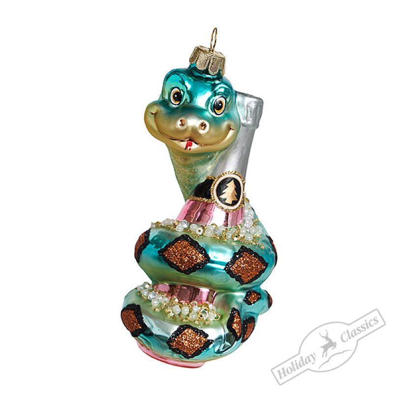 Эта изысканная елочная игрушка в форме змеи захватывает взгляд своим уникальным дизайном и насыщенным бирюзовым цветом. В ее кольцах изящно удерживается бутылка шампанского, что символизирует радость и веселье. Легкий вес игрушки позволяет ей легко зависать на веточках елки, придавая ей стильный и оригинальный вид. Эта игрушка станет не только прекрасным дополнением новогоднего декора, но и заветным талисманом, приносящим удачу и праздничное настроение в каждый дом.