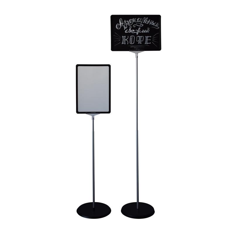 Напольная стойка. Информационное окно с двусторонним доступом. Формат А4. Регулируемая высота ножки от 40 до 65 см. Диаметр основания 22,5 см. Устойчивое металлическое основание.