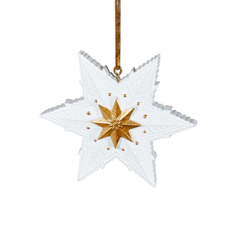 Эта игрушка будто бы создана из песочного теста и присыпана сахарной пудрой. Такие украшения моментально придают новогодней елке сказочный внешний вид и настраивают на праздничный лад. Сочетание золотого и белого оттенков позволяют вписать елочную игрушку практически в любой стиль декорирования. Новогодняя игрушка украшена богатым объемным орнаментом. Такой внешний вид ей удалось придать за счет использования для производства современного материала – полирезины. Для подвешивания елочное украшение снабжено лентой.