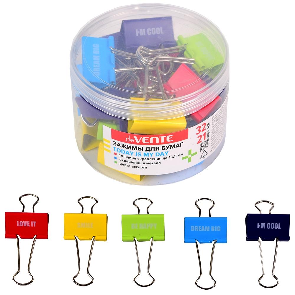 Зажимы для бумаг 32мм 21шт deVENTE цветные 'Today is my day' 5 дизайнов в пластиковой банке
