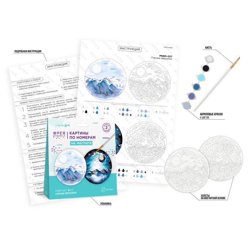 Состав набора: 2 холста на магнитной основе с нанесенным изображением, акриловые краски в пронумерованных баночках, кисть, инструкция с контрольным листом, схемой смешения цветов и эталоном готовой работы.