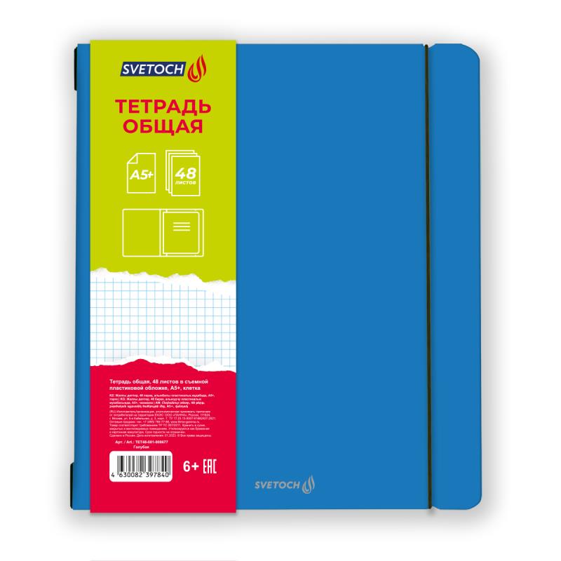 Тетрадь общая со съемной пластиковой обложкой, на резинках А5+ формата, 48 листов, предназначена для учащихся средних и старших классов, учащихся вузов, а также прекрасно подойдет для дома и офиса. Пластиковая обложка не даст тетради помяться и порваться, резинки позволяют сменить тетрадь, держать тетрадь и папку всегда закрытой. Подойдут любые тетради формата А5+. Внутренний блок изготовлен из качественной офсетной бумаги плотностью 65 г/кв. м, 100% белизны. Обложка -пластик 500 мкр. Линовка - клетка.