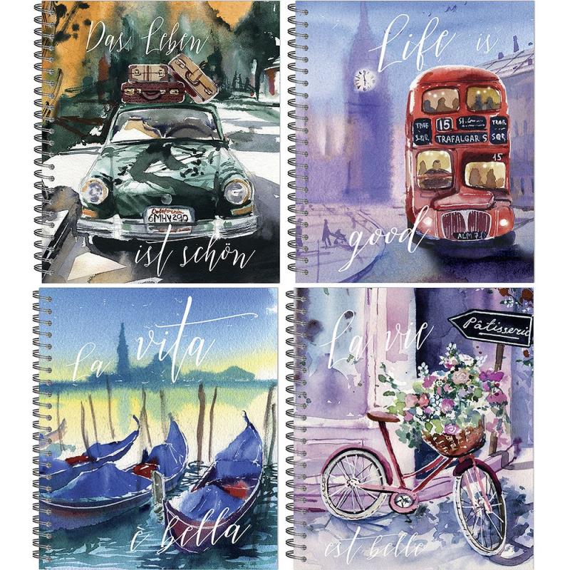 Тетрадь A5  96л клетка на гребне Полином картонная матовая обложка Soft touch выборочный УФ-лак 'Акварельный винтаж' 4 дизайна