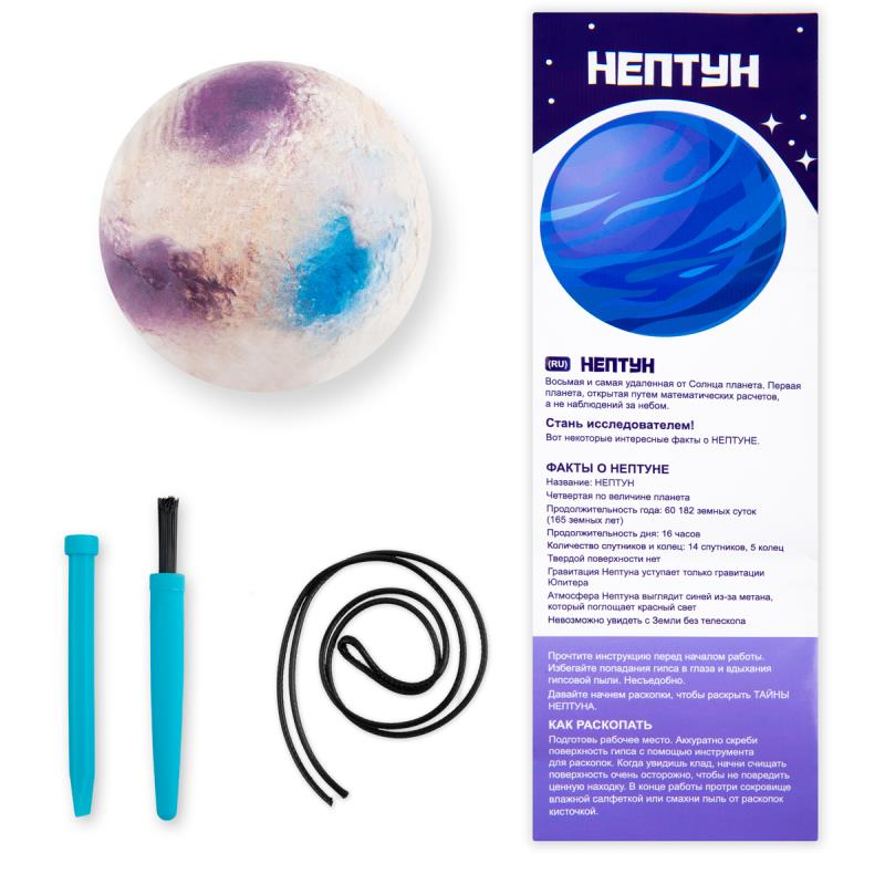 В набор входят: цветная гипсовая планета с сокровищем, инструменты для раскопок , нитка для подвески, цветная инструкция с познавательной информацией о планете.