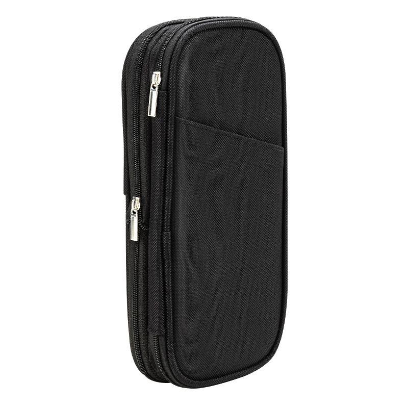 Пенал с одним отделением, перегородкой с держателями для принадлежностей, внутренним и наружними карманами и изменяемым размером.