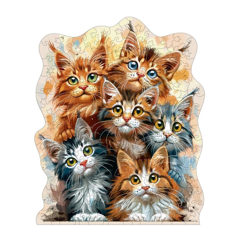 Пазлы выполнены из 100% дерева, поэтому у них надолго сохранится древесный аромат даже после сборки. Для вырезки деталей используются высокоточные лазерные станки, все края деталей обжигаются для избегания заноз и наилучшей состыковки при сборке пазлов. В наборе нет ни одного повторяющегося элемента, все они имеют свою уникальную форму: есть фигуры сложной формы, а есть детали в форме конкретного предмета, имеющего отношение к тематике готовой картины. Так, например, из элементов в форме зайца, волка и лисы можно получить часть готового рисунка в виде горы.