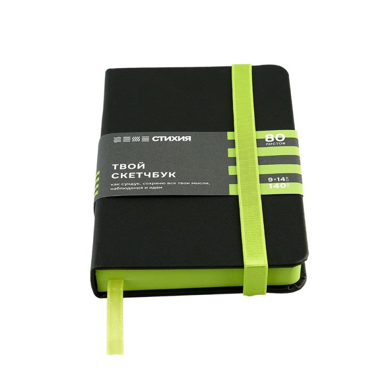 Блокнот для набросков Стихия  9х14см 140г  80л твердый переплет на резинке черный с салатовым срезом