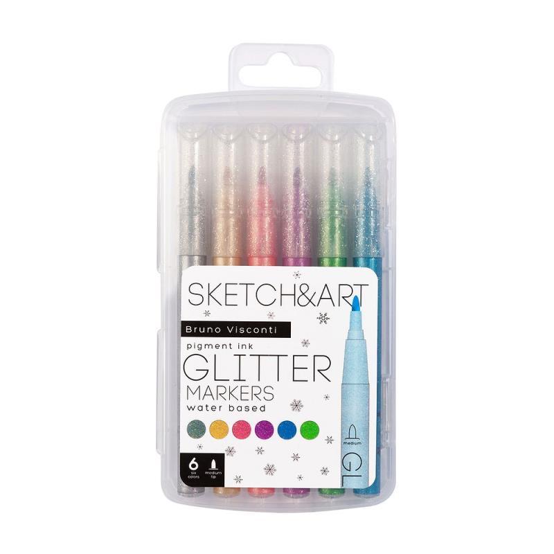 Набор маркеров с глиттером на водной основе. Чернила водостойкие и светостойкие, не имеют запаха и нетоксичны. Подача чернил осуществляется путем нажима кончиком маркера на поверхность (бумагу, пластик, дерево и др.). Перед каждым использованием маркер необходимо потрясти для лучшего смешивания компонентов, а после использования плотно закрыть колпачок. Блестящее напыление в чернилах делает рисунок ярким и сияющим. Эффект мерцания хорошо передается как на светлой, так и на темной бумаге. Наконечник, устойчивый к истиранию, и повышенное содержание чернил гарантируют долгий срок службы маркера. Набор подходит для детского и юношеского творчества, а также для декорирования различных изделий: открыток, бумажных поделок, фотоальбомов и т.д. Маркеры безопасны при использовании по назначению. Рекомендуется хранить в горизонтальном положении.