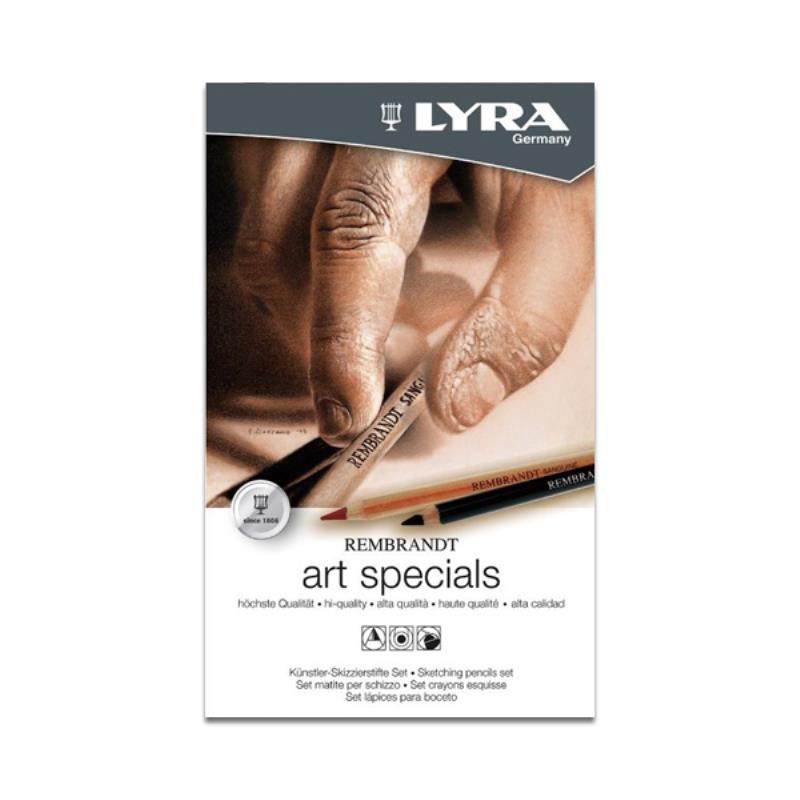 LYRA REMBRANDT ART SPECIALS SET - набор художественных высококачественных карандашей с особо прочными грифелями. Диаметр грифеля 4 мм. Идеальный выбор для тех, кто занимается рисованием и набросками. Эти карандаши легко смешиваются, что позволяет выполнять различные техники. Карандаши позволяют достигать четкости контуров, насыщенности штриховки и тонкости полутонов. Для сохранения работы можно использовать специальный фиксатив.
