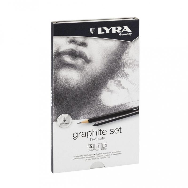 LYRA GRAPHITE SET это - набор инструментов, материалов и графитовых карандашей с особо прочными грифелями. Идеально подходит для технического рисования и графики и особенно - для художественных рисунков, требующих высокой четкости и мельчайших деталей. В наборе 11 предметов в металлическом пенале.