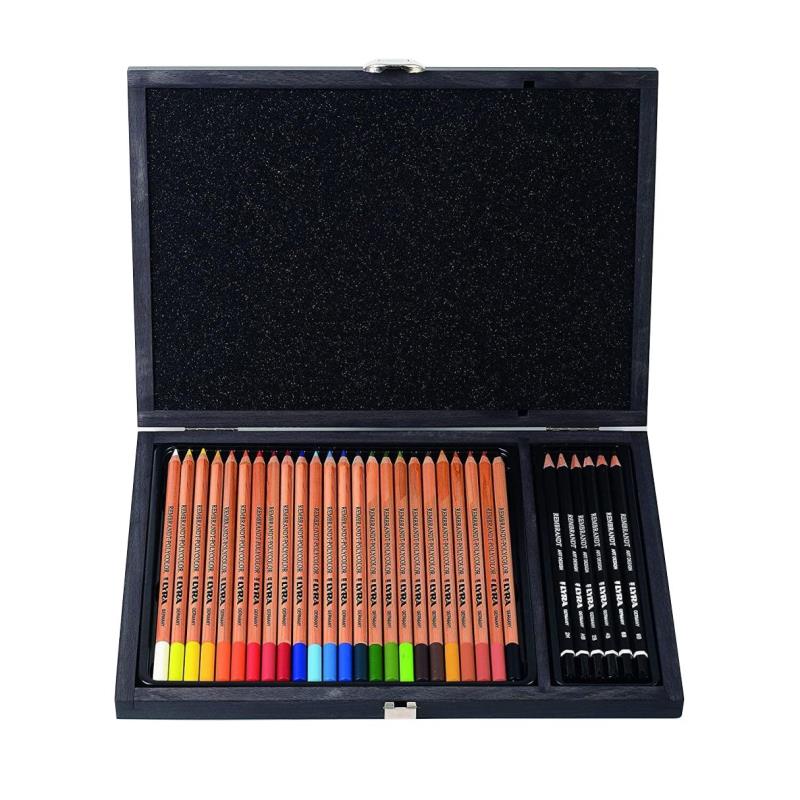 Состав набора: 24 цветных карандаша Rembrandt Polycolor и 6 чернографитных карандашей Art Design разных степеней мягкости.