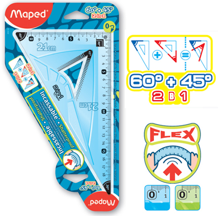 Гибкие и 100% ударопрочные: товары серии Flex не ломаются при скручивании, сгибании и ударах в школьном рюкзаке. Угольник сочетает в себе два угольника: на 45 и 60 градусов. Эргономичный держатель. Отметка «0» находится в прямом угле: удобно отмерять и чертить одновременно. Высококачественная градуировка нанесена с использованием УФ чернил для наилучшей устойчивости. Цвет ассорти.
