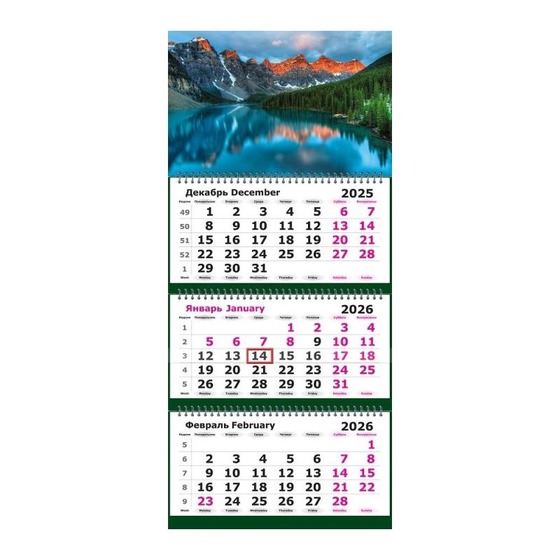 Календарь настенный 2026 квартальный 3-блочный 19х55см Мини 'Голубое отражение' на гребне