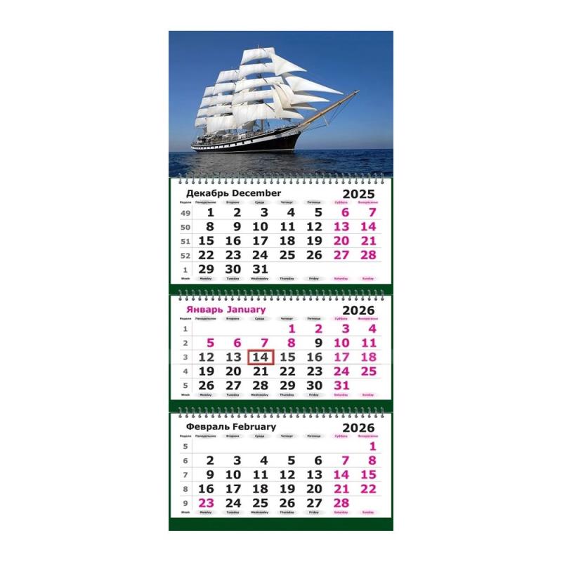 Календарь настенный 2026 квартальный 3-блочный 19х55см Мини 'Парусник' на гребне