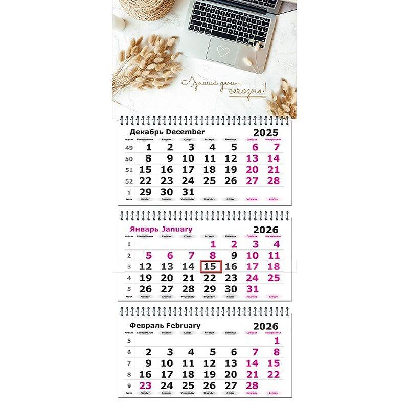 Календарь состоит из красочного постера и трех блоков. Каждый блок включает 12 листов офсетной бумаги закрепленных на металлическом гребне.