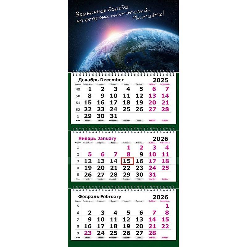 Календарь состоит из красочного постера и трех блоков. Каждый блок включает 12 листов офсетной бумаги закрепленных на металлическом гребне.