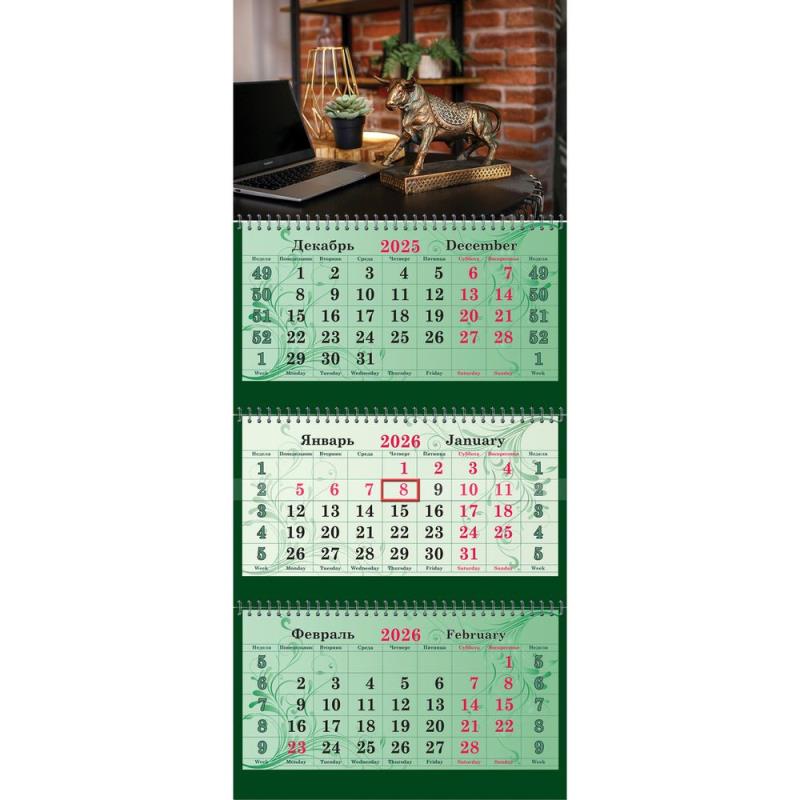 Календарь трехблочный состоит из красочного постера и трех блоков. Оснащен двумя люверсами (металлическими кольцами) для подвешивания.