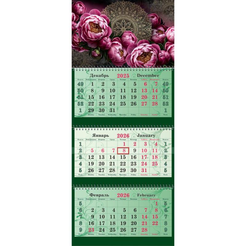 Календарь трехблочный состоит из красочного постера и трех блоков. Оснащен двумя люверсами (металлическими кольцами) для подвешивания.