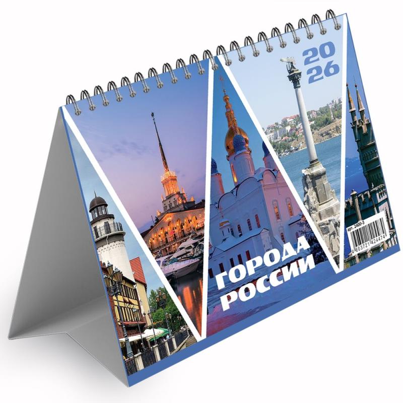 Календарь-шалашик настольный. На каждом листе — красочное изображение и календарная сетка на текущий месяц, а также миниатюрные сетки на предыдущий и последующий месяцы.