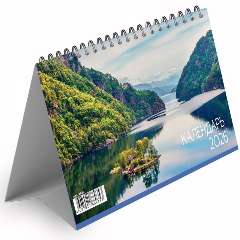 Календарь-шалашик настольный. На каждом листе — красочное изображение и календарная сетка на текущий месяц, а также миниатюрные сетки на предыдущий и последующий месяцы.