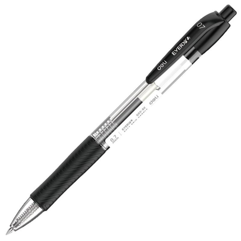 Автоматическая шариковая ручка Deli 'EveryU' с чернилами низкой вязкости для особо гладкого письма и мягкой резиновой манжетой для пальцев.