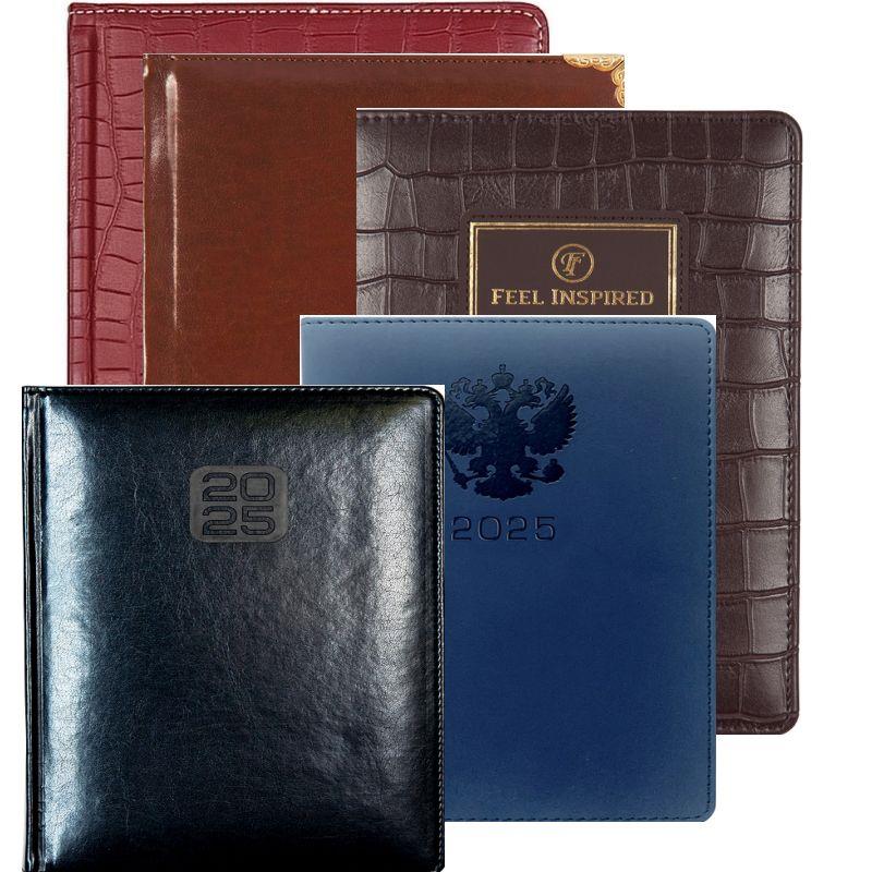 Датированный еженедельник с твердой обложкой из искусственной кожи с поролоном, отстрочкой, закругленными уголками, c перфорацией уголков, 2 ляссе, в подарочной коробке.