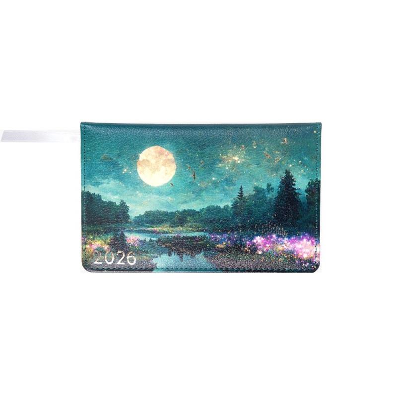 Датированный карманный планинг с твердой обложкой из искусственной кожи с поролоном, отстрочкой и цветной печатью, тиснением фольгой, перфорацией уголков, закругленными уголками и ляссе.