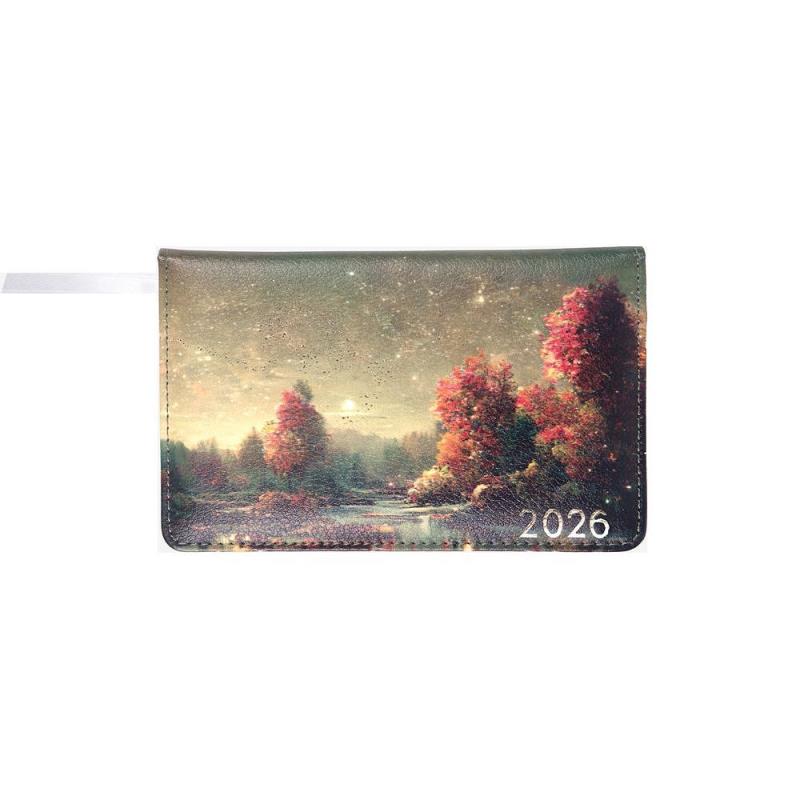 Датированный карманный планинг с твердой обложкой из искусственной кожи с поролоном, отстрочкой и цветной печатью, тиснением фольгой, перфорацией уголков, закругленными уголками и ляссе.