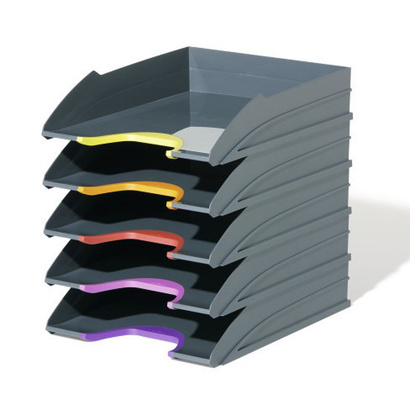 Комплект горизонтальных лотков с цветными вставками. Сочетается с боксами для документов Varicolor. В комплекте 5 штук. Устанавливаются друг на друга, в том числе лесенкой. Цветные вставки служат также дополнительным признаком сортировки документов. Для документов формата А4.
