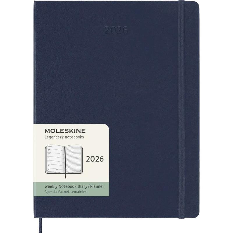 Еженедельник Moleskine формата XLarge в твердой обложке, на левой странице которого отображаются намеченные на текущую неделю встречи, а правая линованная страница предназначена для записи заметок и идей. Такой формат делает планировщик удобным и многофункциональным. Закругленные углы, эластичная застежка, фирменная бумага Moleskine цвета слоновой кости. Внутренний блок содержит полезную информацию: планирование, часовые пояса, международные меры, телефонные коды и продолжительность полетов. Кармашек на задней стороне обложки содержит наклейки. Лента-закладка в тон обложки.